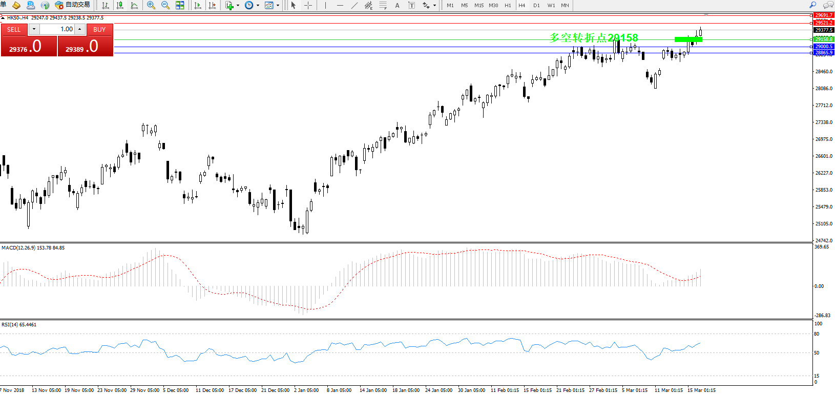 交易策略:29158上方看涨,目标29521、29691