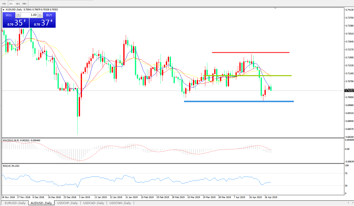 技术面简析:日图均线有序空头排列看跌,汇价多空转折区域下方反弹整理,MACD下穿0轴且动能柱0轴下方继续放量,RSI止跌回升,预计 汇价反弹整理后将进一步下行。