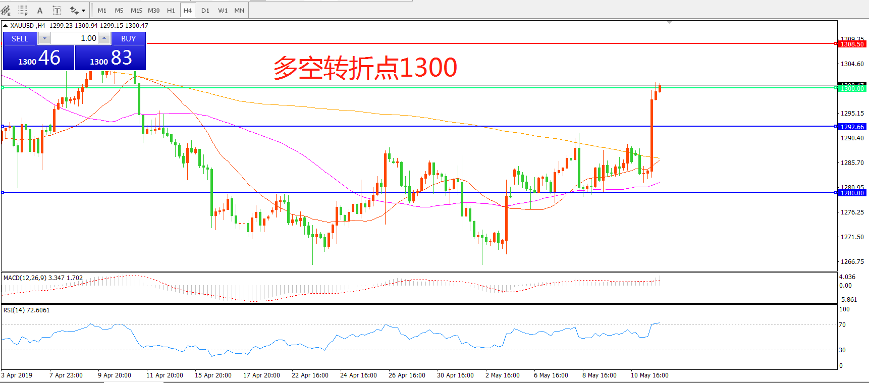 多空转折点:1300.00