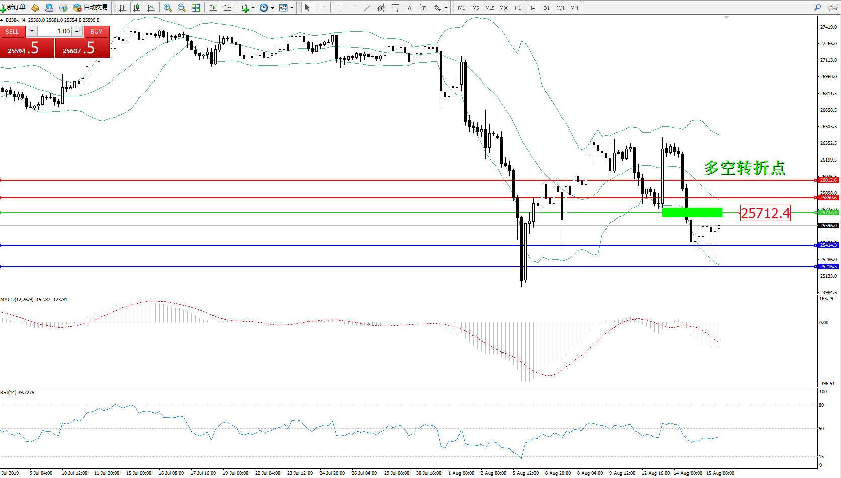 道琼斯指数DJ30—— 4小时K线图显示: