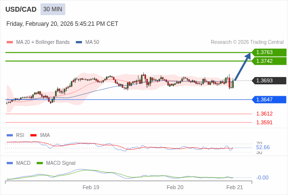 美元/加元 当日内 : 调整至 1.3647 处,在反弹上升之前。