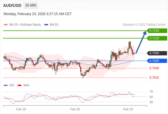 在 0.7060 之上,看涨,目标价位为 0.7120 ,然后为 0.7140 。