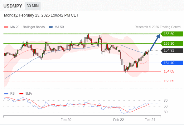 在 154.40 之上,看涨,目标价位为 155.20 ,然后为 155.60 。