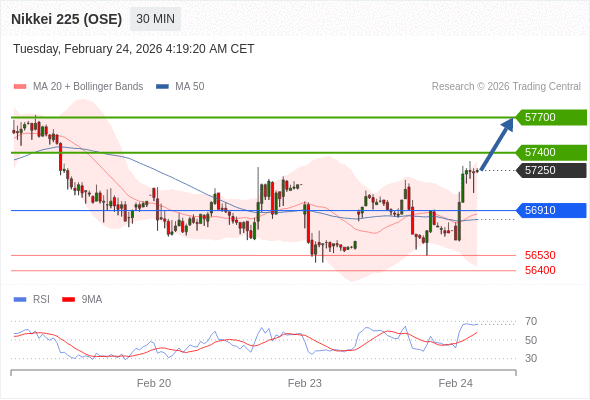 在 56910 之上,看涨,目标价位为 57400 ,然后为 57700 。