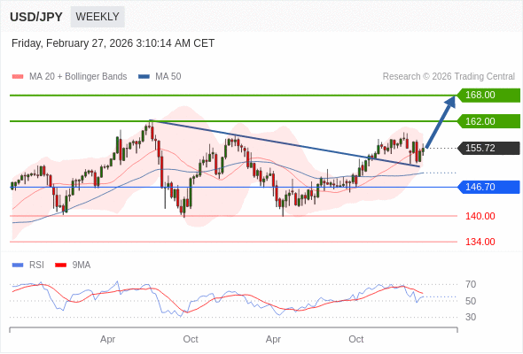 在 146.70 之上,看涨,目标价位为 162.00 ,然后为 168.00 。