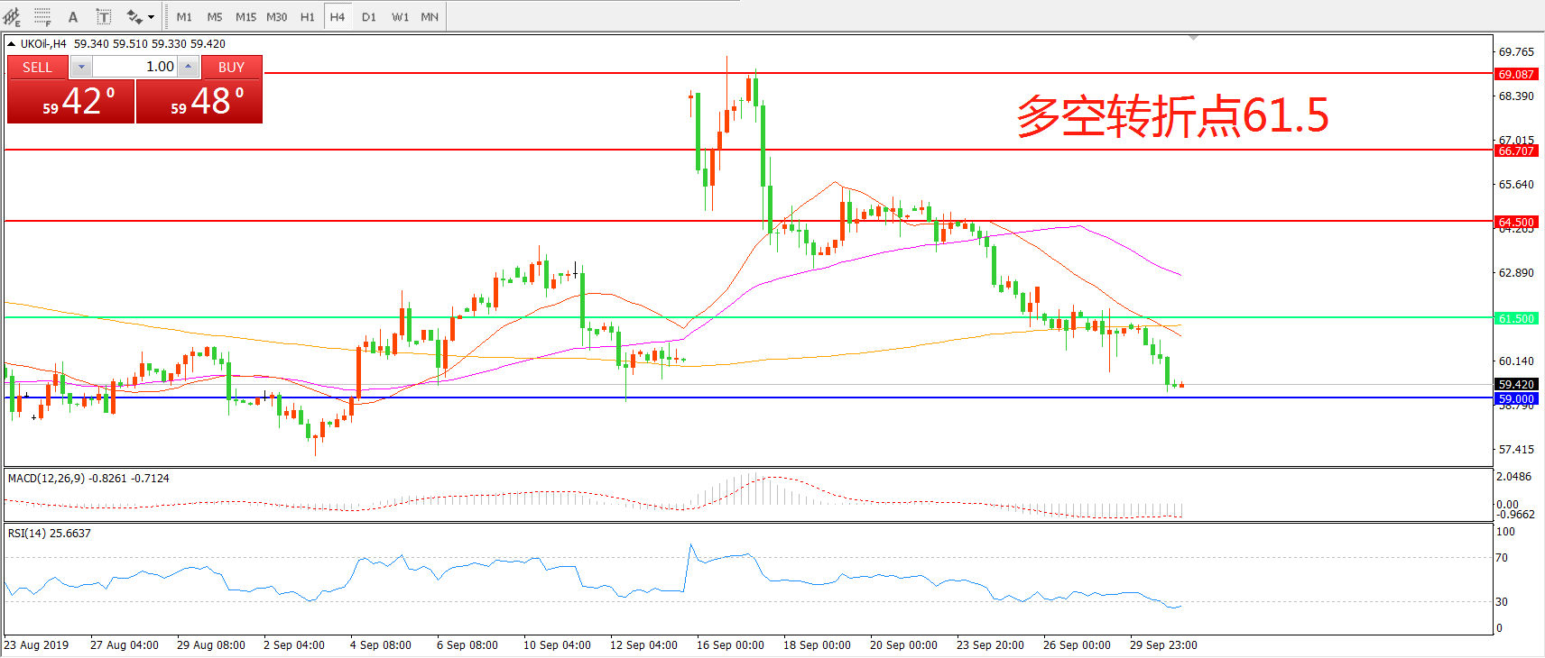4小时图看,油价破位下行,整体走势较弱,59美金一线形成短期支撑,均线系统拐头向下,MACD绿柱增加,RSI指标走平,日内延续下行概率较大。