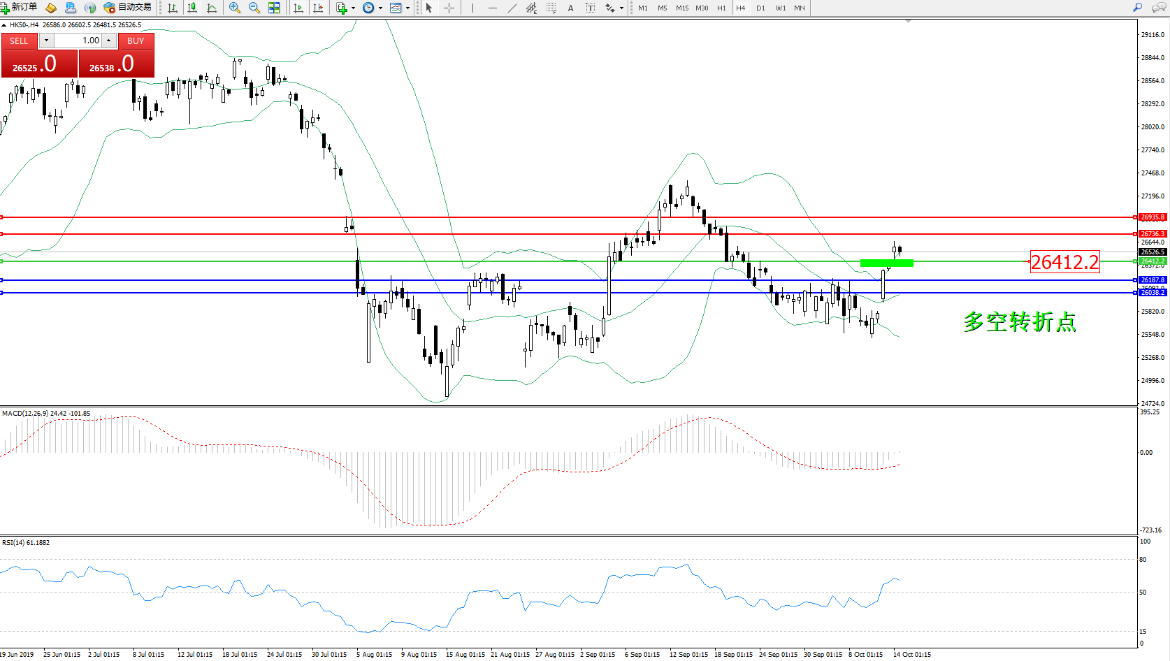 香港恒生指数1014日(周一)收盘上涨213.41点,涨幅0.81%,报26521.85点;港股早上跟随外围造好而高开212点,随后再向上寻顶,恒指高见26636。续在高位上横行。国际贸易关系进展的相关消息提振股市上扬。市场对英国达成脱欧协议的乐观预期升温。美国经济数据支持美联储降息预期,且贸易关系磋商步入良性阶段也给市场带来稳定因素。
