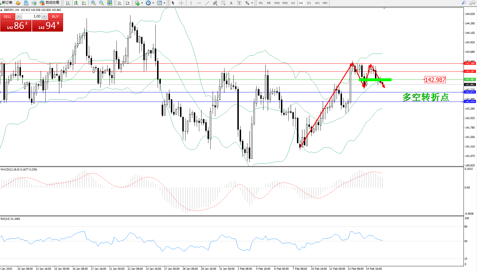 交易策略:142.987下方看跌,目标142.671、142.434