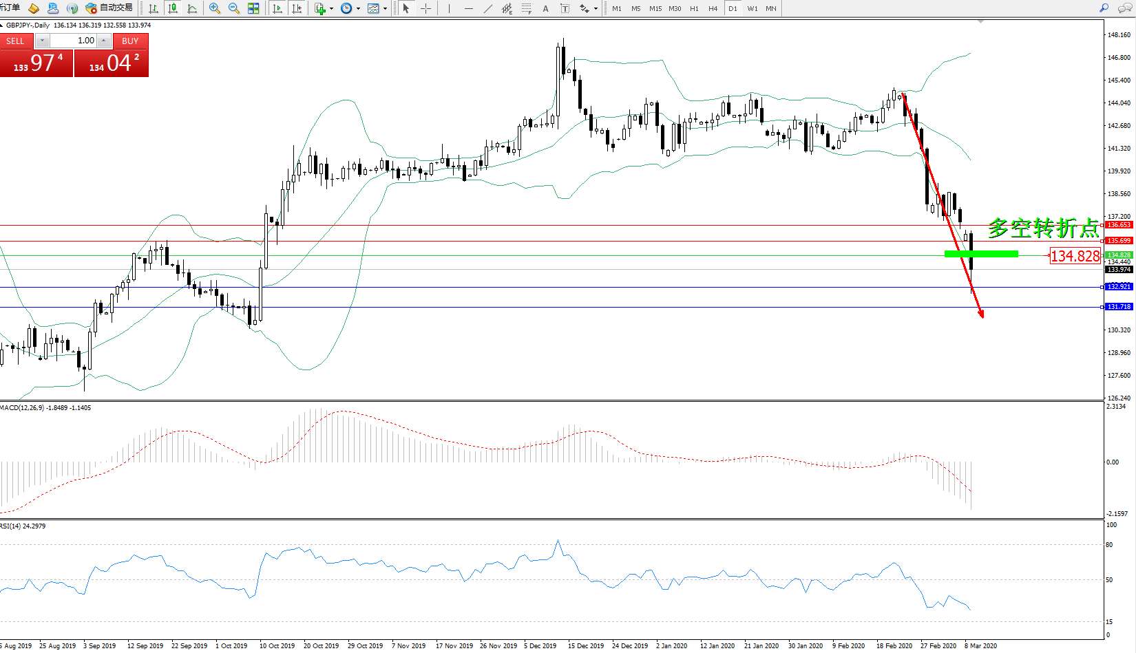 交易策略:134.828下方看跌,目标132.921131.718