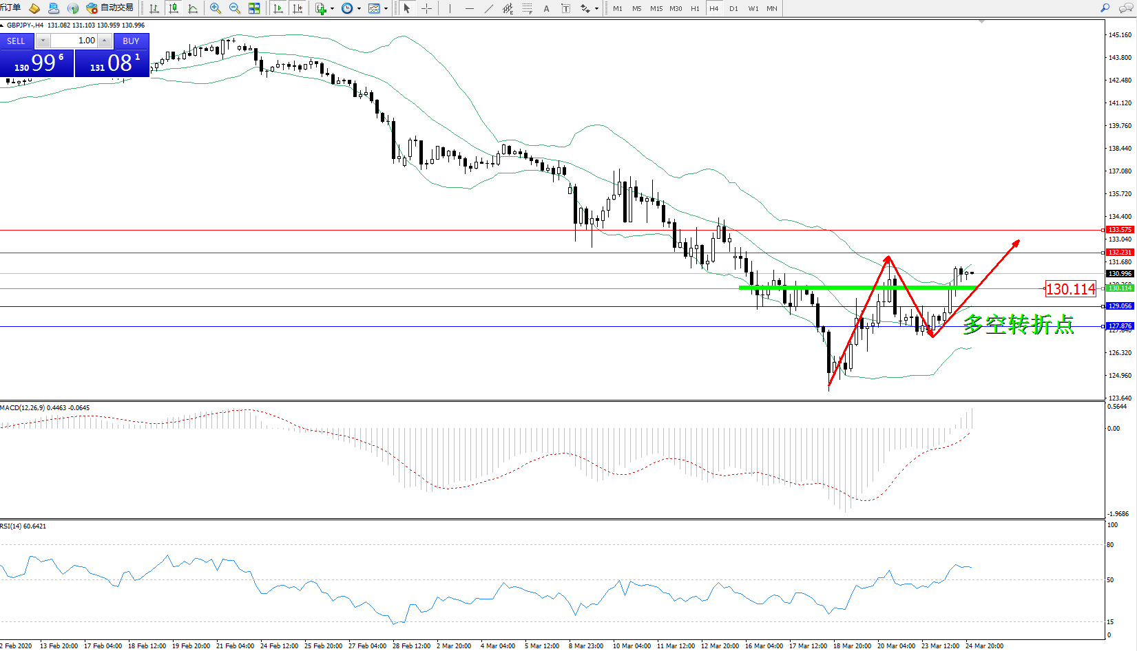 交易策略:130.114上方看涨,目标132.231133.575