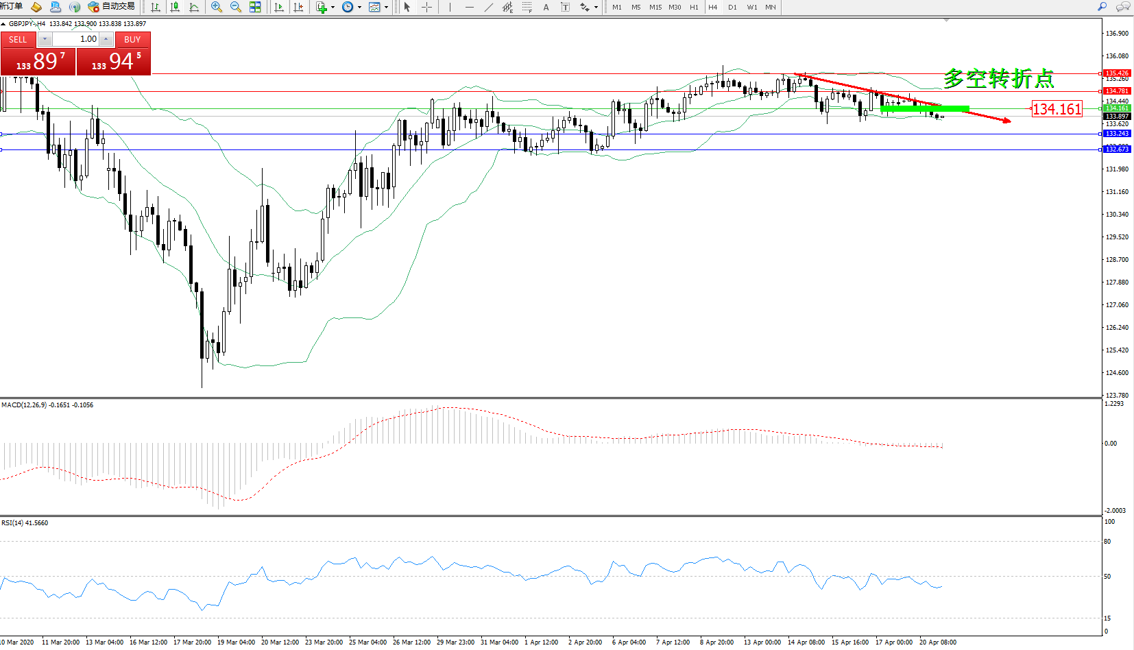 交易策略:134.161下方看跌,目标133.243、132.673