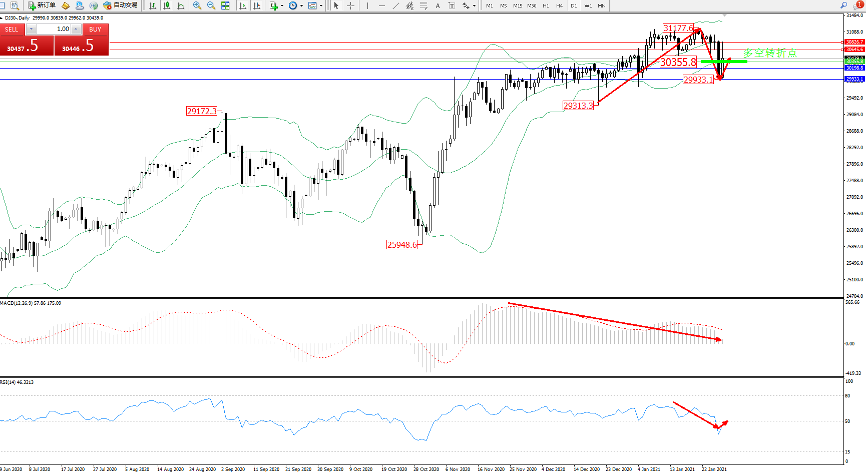 道琼斯指数DJ30—— 日K线图显示: