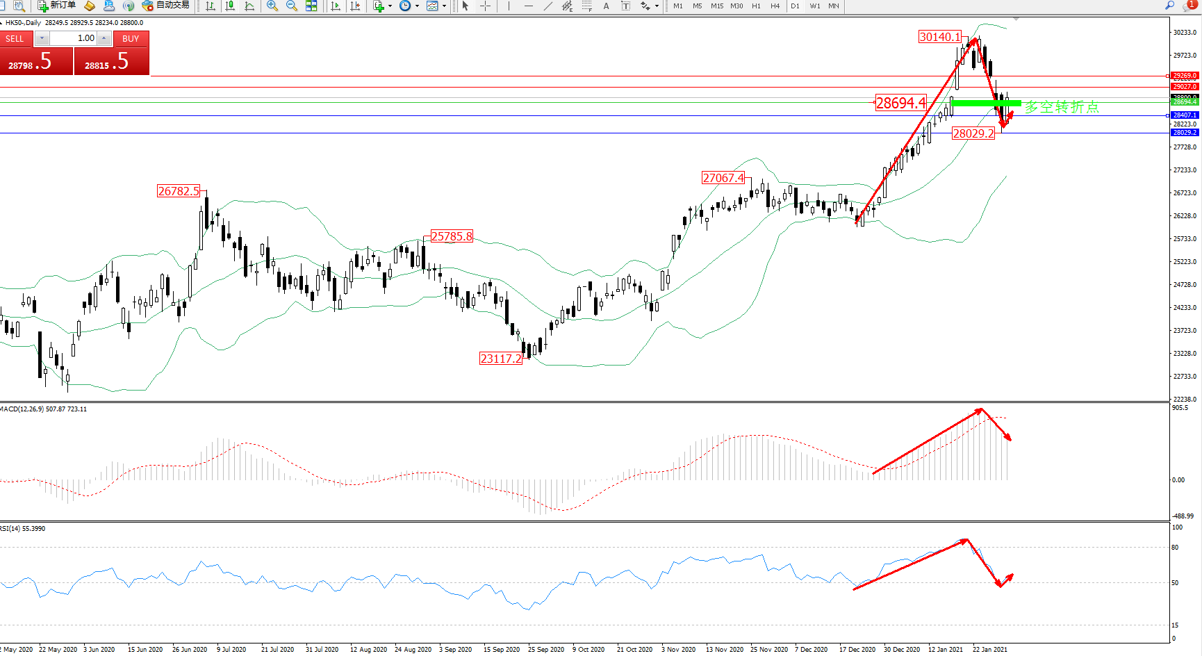 技术点评:高位空头动力急速回撤至布林带指标通道中下轨区间持续震荡后快速拉升,纠结于中轨附近节点宽幅震荡,布林带指标呈收口走势持续中,短期或将维持在布林带指标通道中轨附近节点整理,MACD指标处于多头区域高位维持整理震荡回撤下行,RSI指标处于多头区域震荡回撤至50均衡线附近得到短暂支撑后有回升迹象;