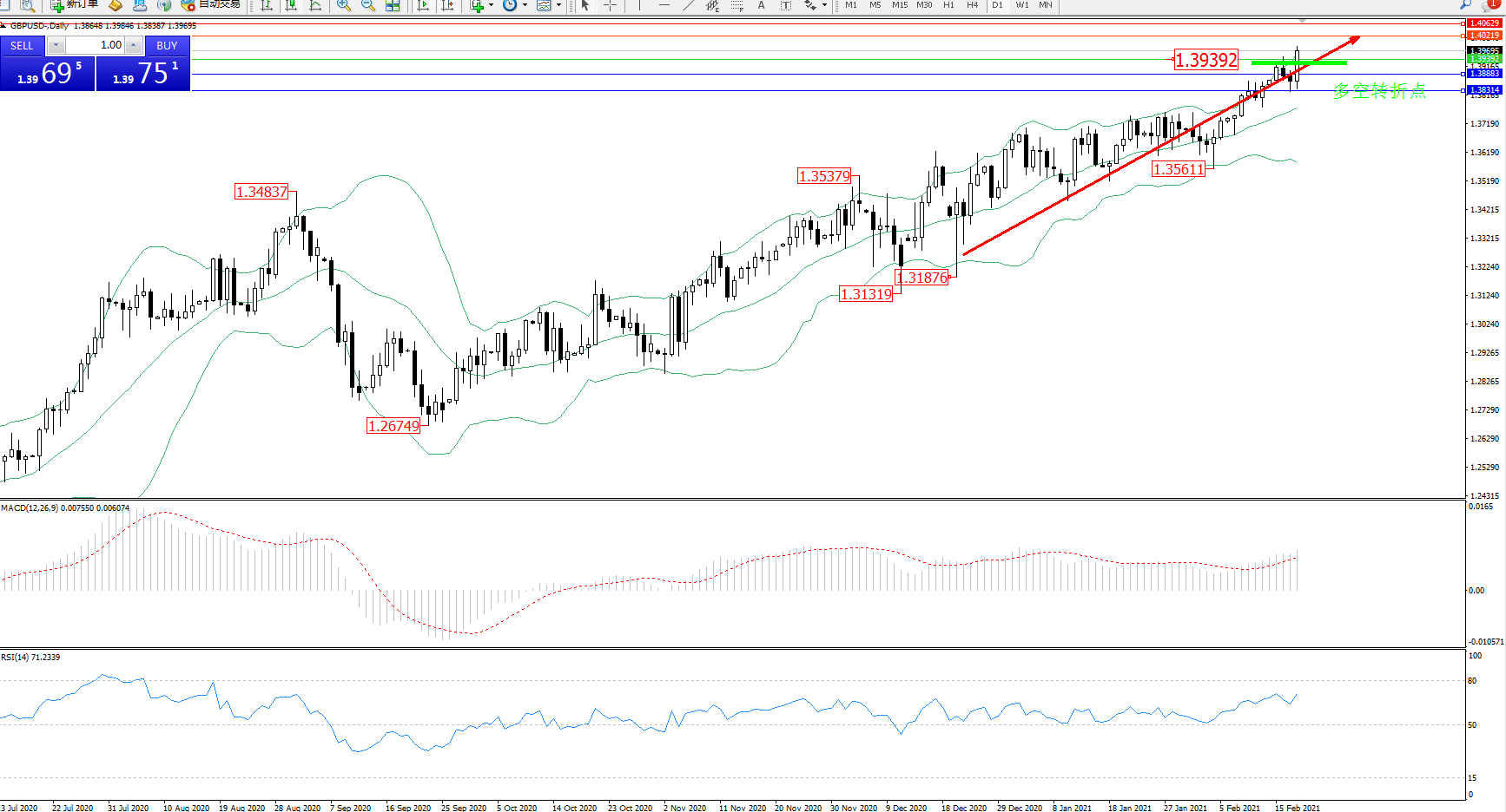交易策略:1.39392上方看涨,目标1.40219、1.40629