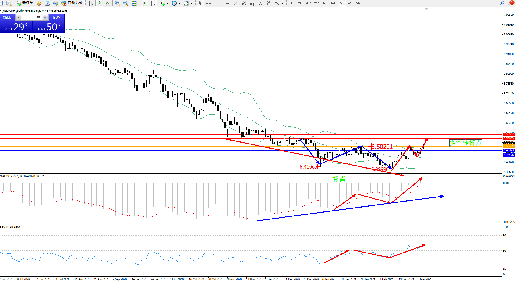 交易策略:6.50201上方看涨,目标6.53689、6.55567