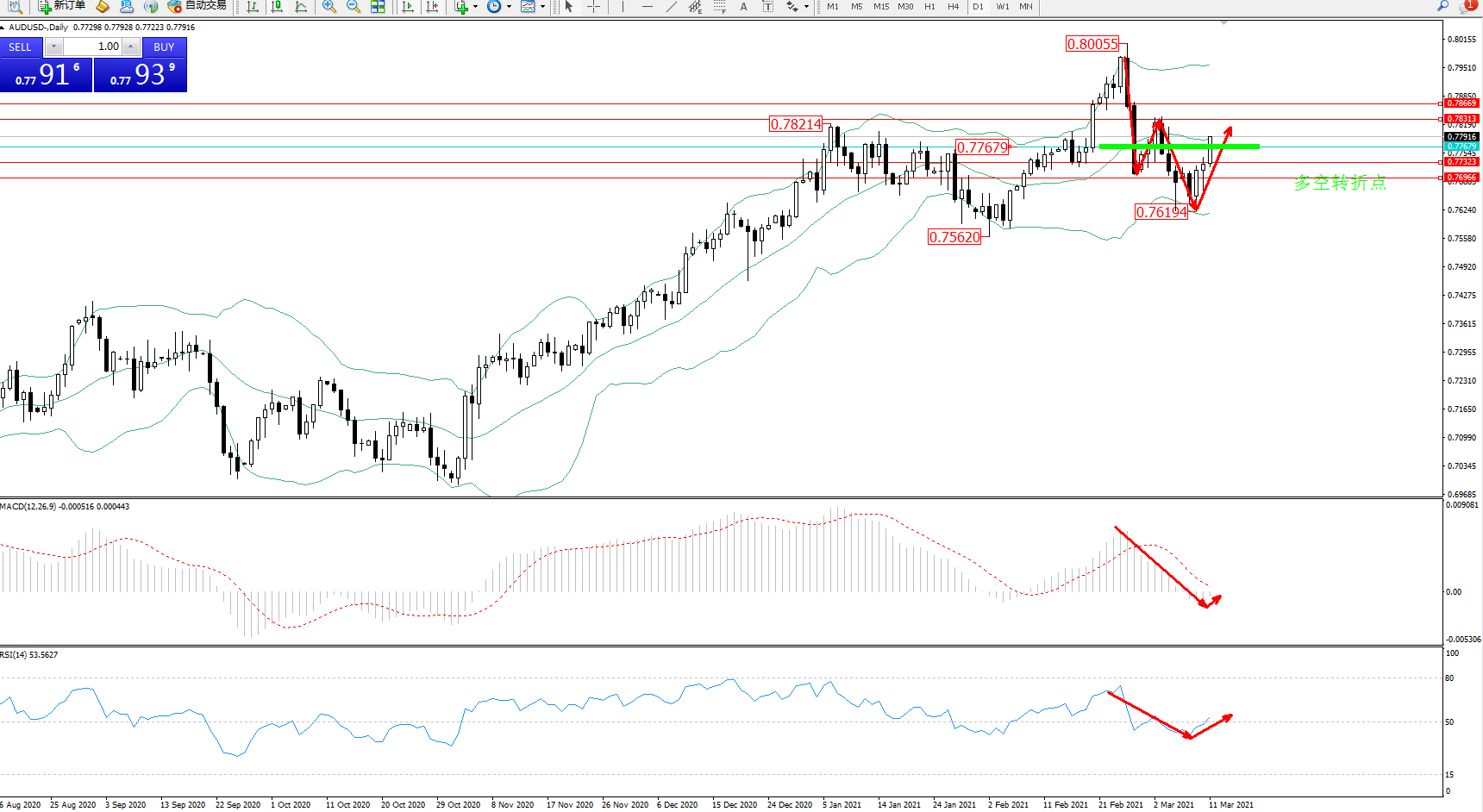 交易策略:0.77679上方看涨,目标0.78313、0.78669