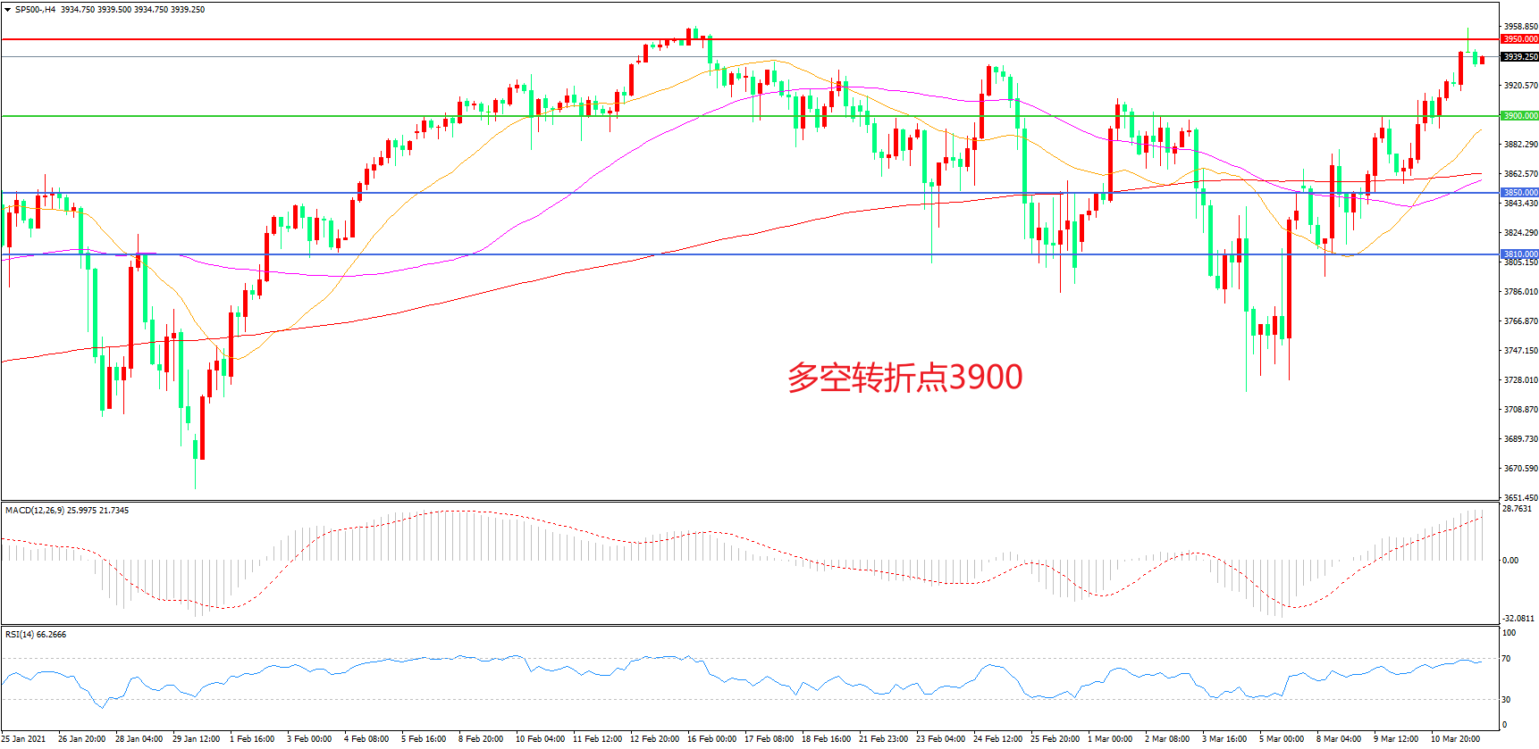 4小时图看,标普500长阳拉升,短期走势有所回暖,均线系统走平形成下方支撑,3900成为多空分水岭,MACD红柱增加,RSI指标走平,日内震荡上行概率较大。