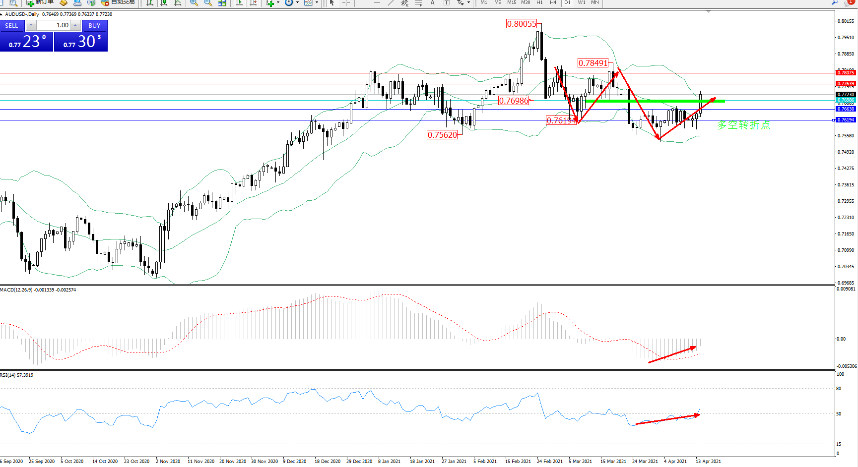 交易策略:0.76986上方看涨,目标0.77639、0.78075