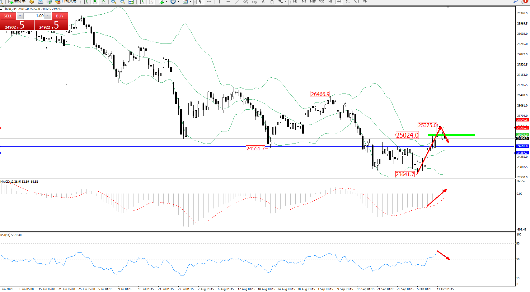 恒指HK50 ——4小时K线图显示: