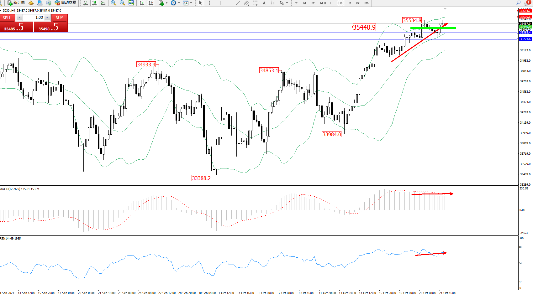 道琼斯指数DJ30——4小时K线图显示: