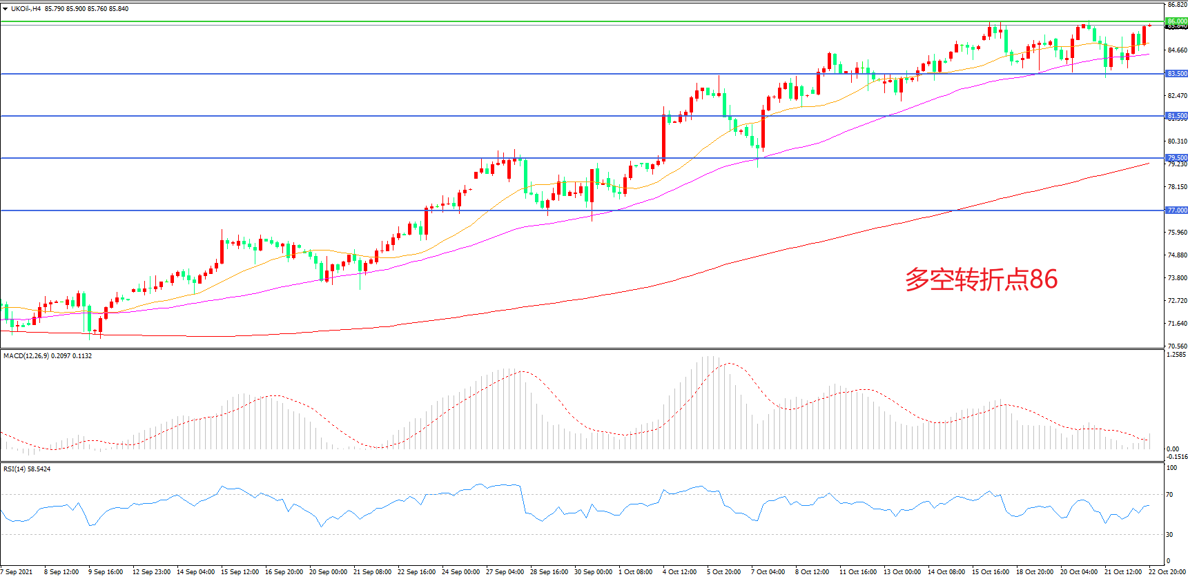 4小时图看,油价以21均线为依托,整体呈现上行形态,MACD红柱增加,RSI指标走平,日内延续上行概率较大。