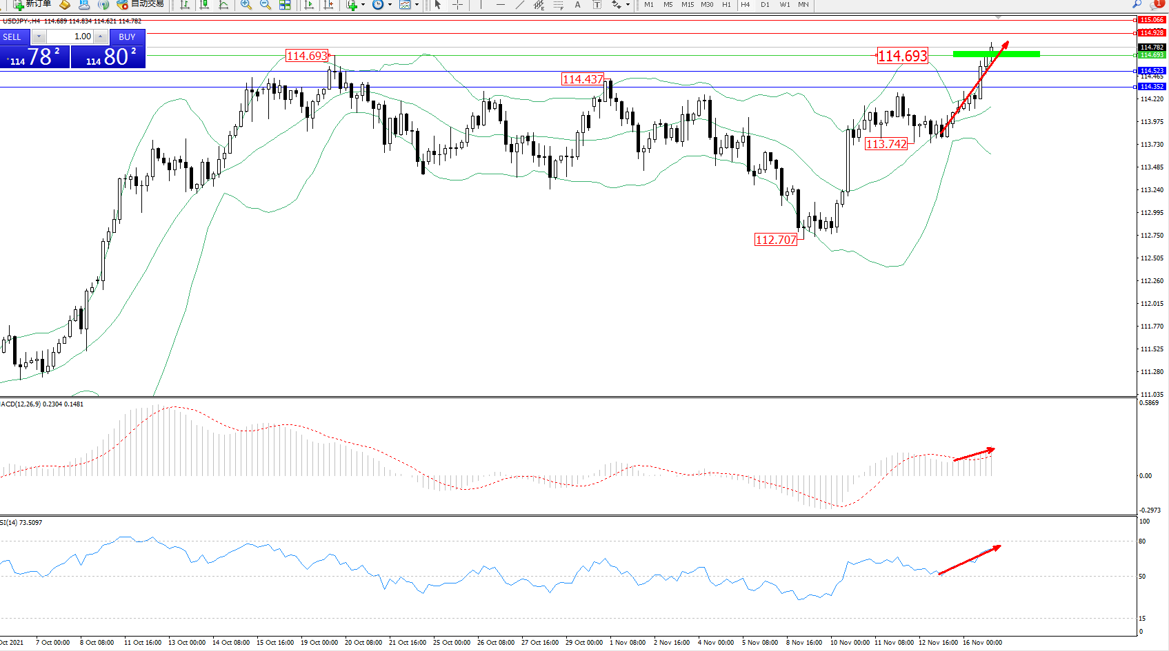 技术点评:多头动力延续布林带指标上轨附近节点持续震荡上扬,多头动力突破前期高位114.693位置后持续攀升,且未见止步迹象,布林带指标呈张口走势良好,MACD指标处于多头区域维持整理上移中,RSI指标处于多头区域持续震荡拉升中;