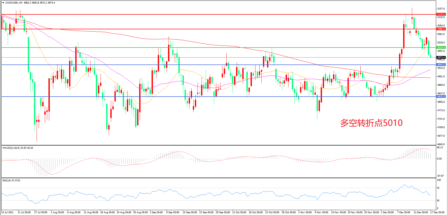 4小时图看,沪深300长阴下破,短期走势低迷,5010一线被跌破, MACD红柱缩短,RSI指标走平,日内延续震荡概率较大。
