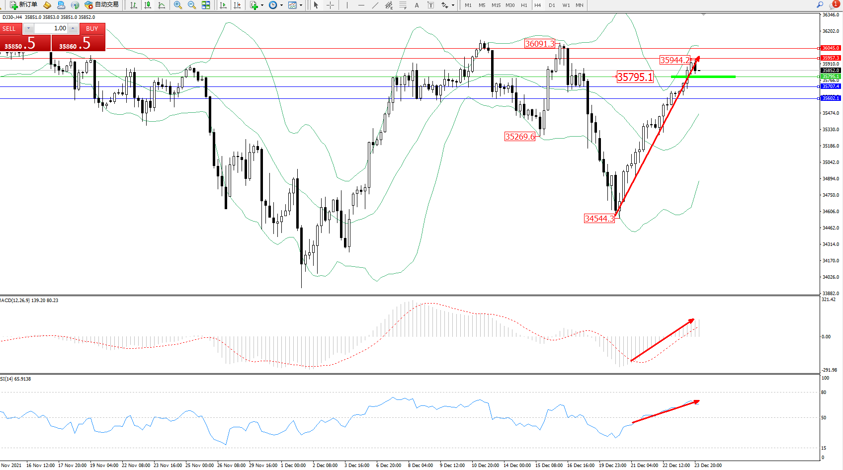 技术点评:多头动力延续布林带指标上轨附近强势拉升上扬,高位抵达35944位置节点后维持震荡,前期高位36090位置近在咫尺破位在即,布林带指标呈收口走势震荡向上移动中,MACD指标处于0轴线上方维持整理上移中,RSI指标处于50均衡线上方多头区域持续震荡整理;