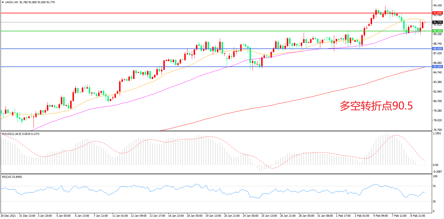 4小时图看,油价受阻于93美元后大幅回落,上行趋势暂缓, 90.5美元成为多空分水岭,MACD红柱增加,RSI指标走平,日内震荡上行概率较大。