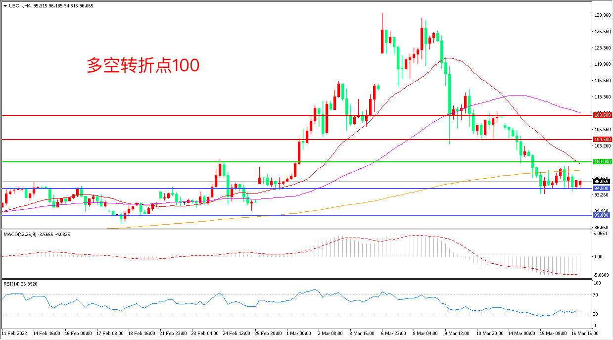 周三(3月16日),有消息称俄乌双方已经准备好一份在乌克兰保持中立、裁军的前提下实施的停火撤军计划,美国WTI原油闻声下挫,收报95.82美元/桶。晚间,美国能源信息署公布的EIA数据显示,美国当周原油库存意外超预期,需求下降仍然给油价短线下行压力,谨防油价出现大幅回落。