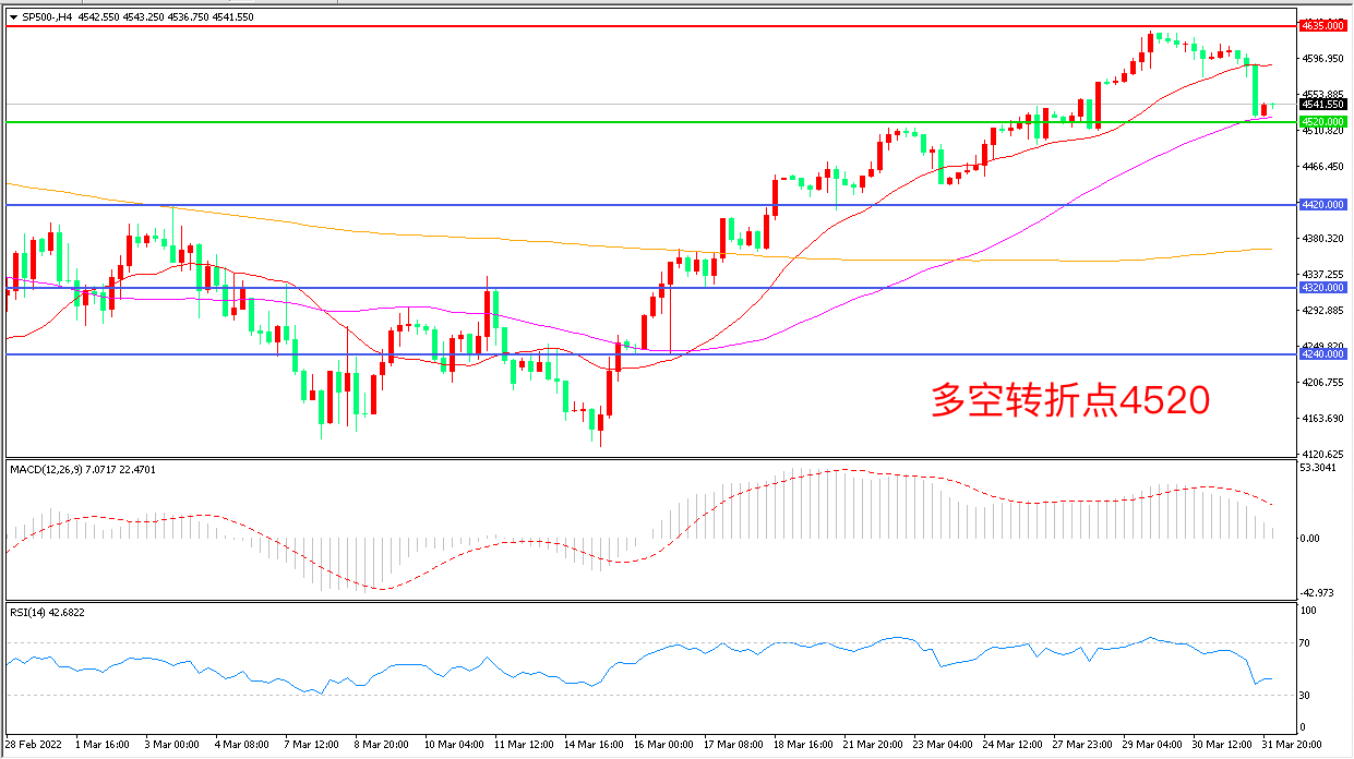 周四(3月31日),北约秘书长称俄军正在乌克兰进行重新部署和集结,准备在顿巴斯地区发动新的攻势,紧张情绪欧美股市加速回落,标普500大幅下行,收报4538.55点。今晚市场将迎来最重磅的非农就业人口数据,如果非农数据出现爆冷,美股可能出现巨幅波动。