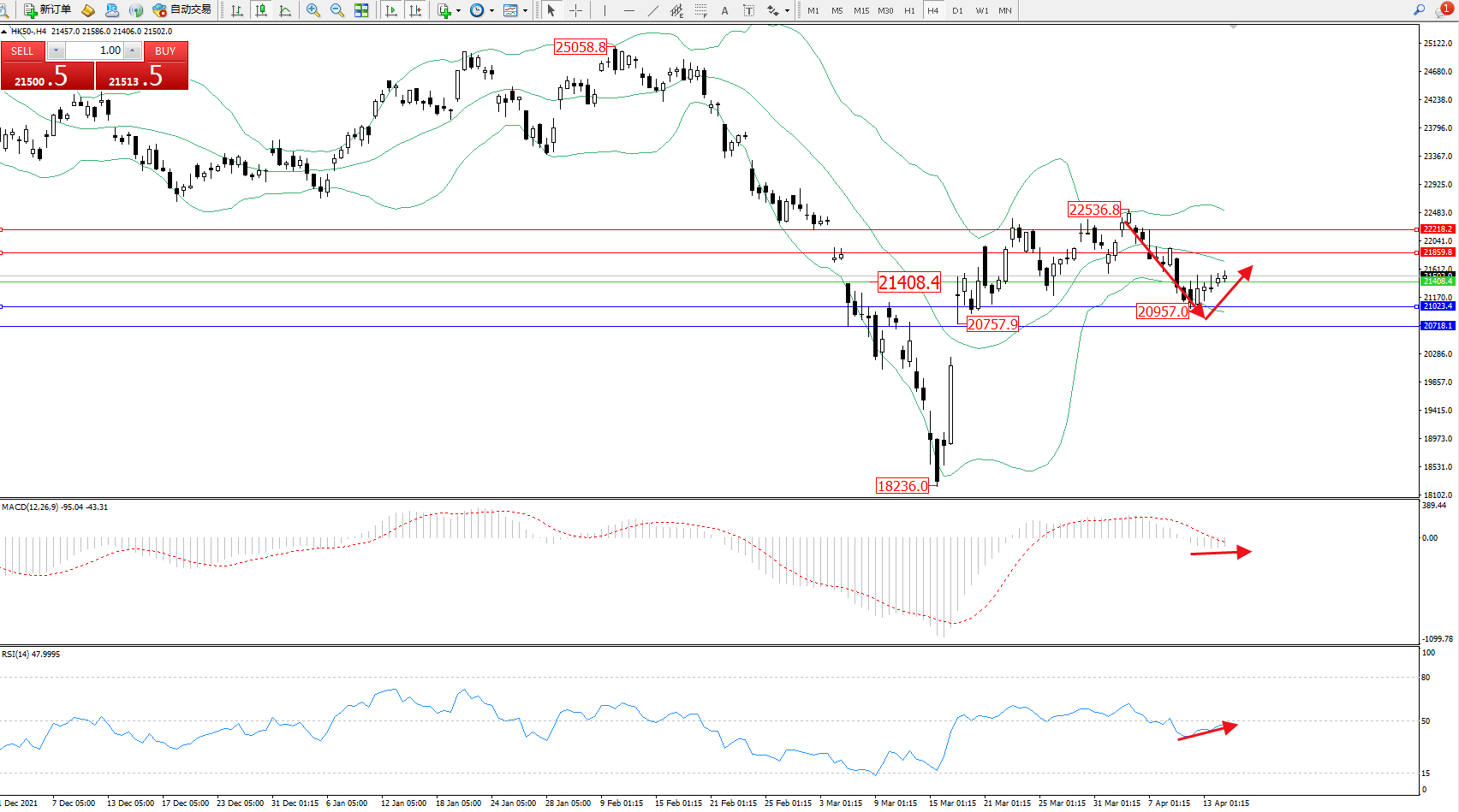 恒指HK50 ——4小时K线图显示: