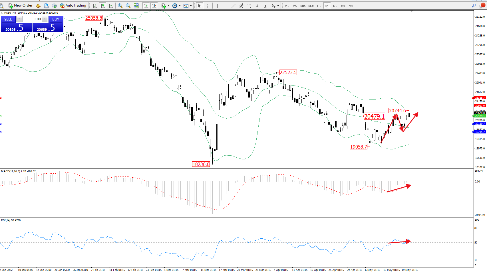 恒指HK50 ——4小时K线图显示: