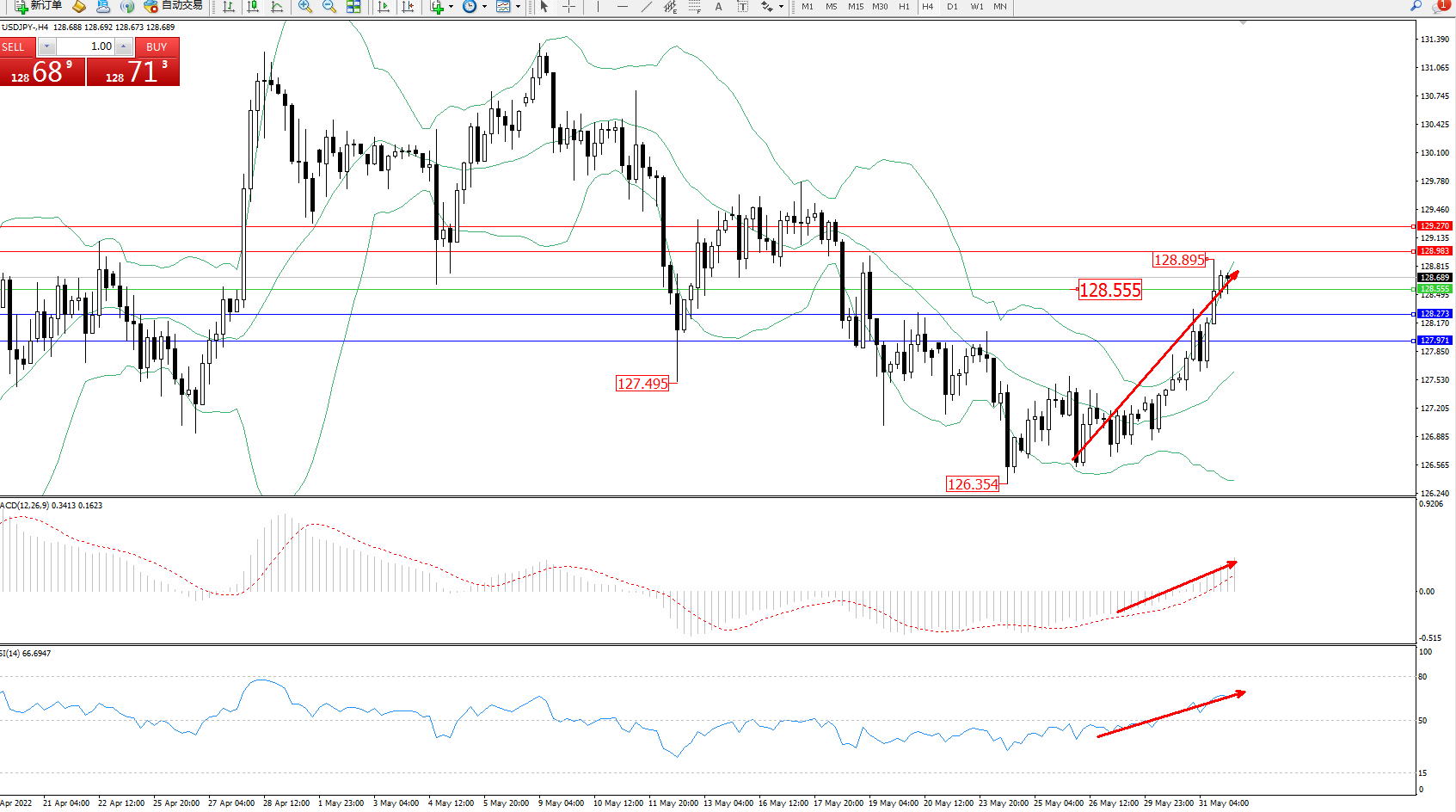 交易策略:128.555上方看涨,目标128.983、129.270