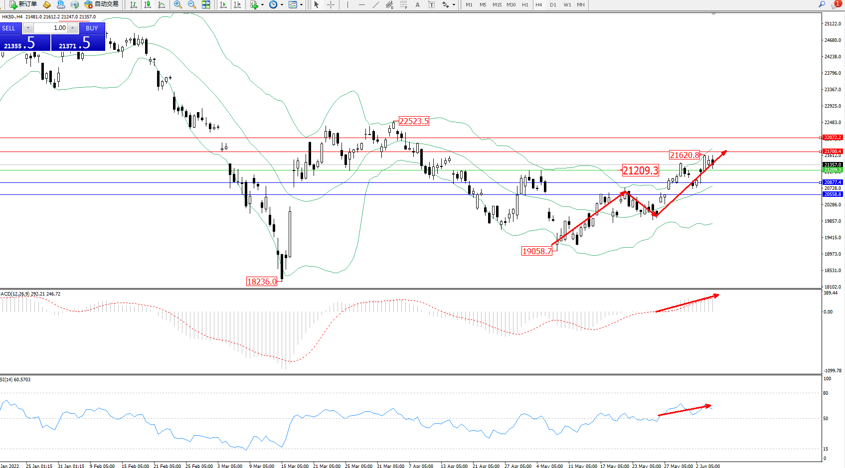 恒指HK50 ——4小时K线图显示: