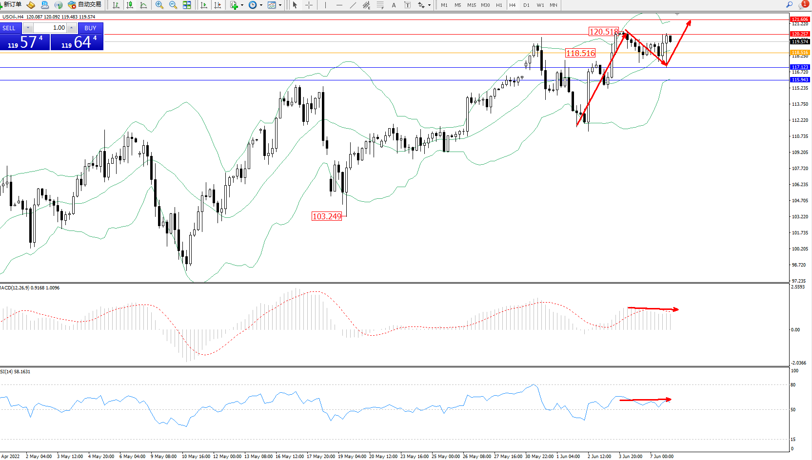交易策略:118.516上方看涨,目标120.257、121.606