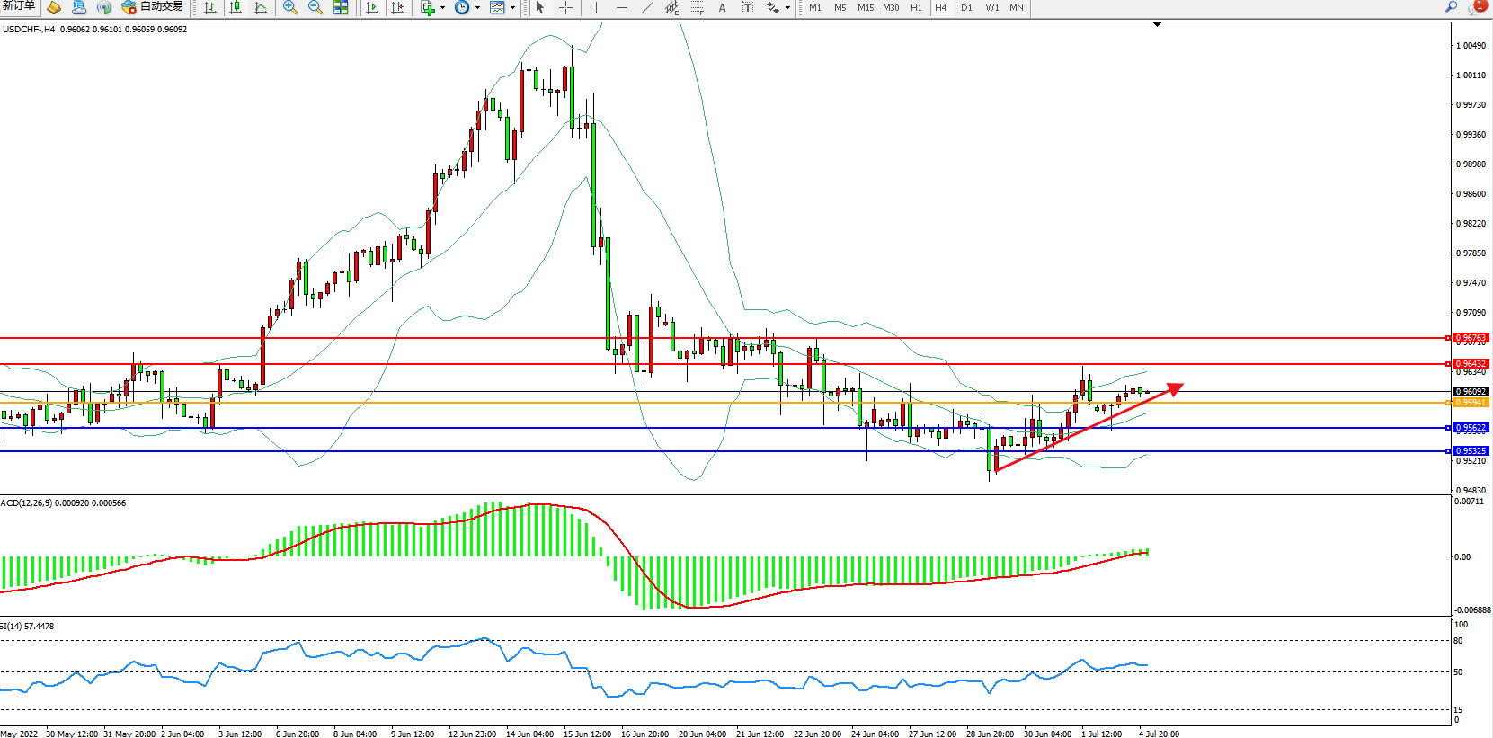 4小时图看:低位多头动力维持在布林待指标通道中上轨区间持续震荡上移,布林带指标呈缓慢张口走势持续向上移动,MACD指标处于0轴线上方徘徊,RSI指标处于50均衡线上側窄幅整理;