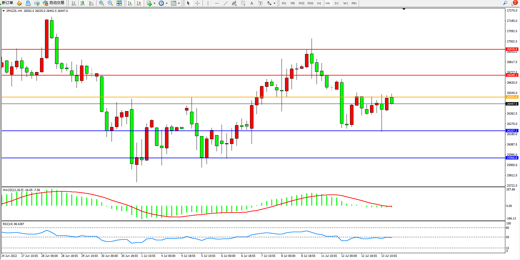 日经225指数7月13日(周三)收盘上涨136.84点,涨幅0.52%,报26473.50点。日本经济产业大臣萩生田光一:日本需要对能源危机作出紧急反应。要实现能源来源多元化,保障稳定供应。