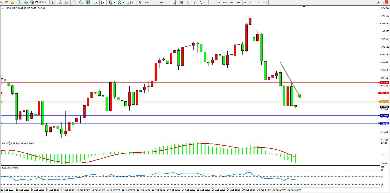 交易策略:95.461下方看跌,目标93.905、93.061