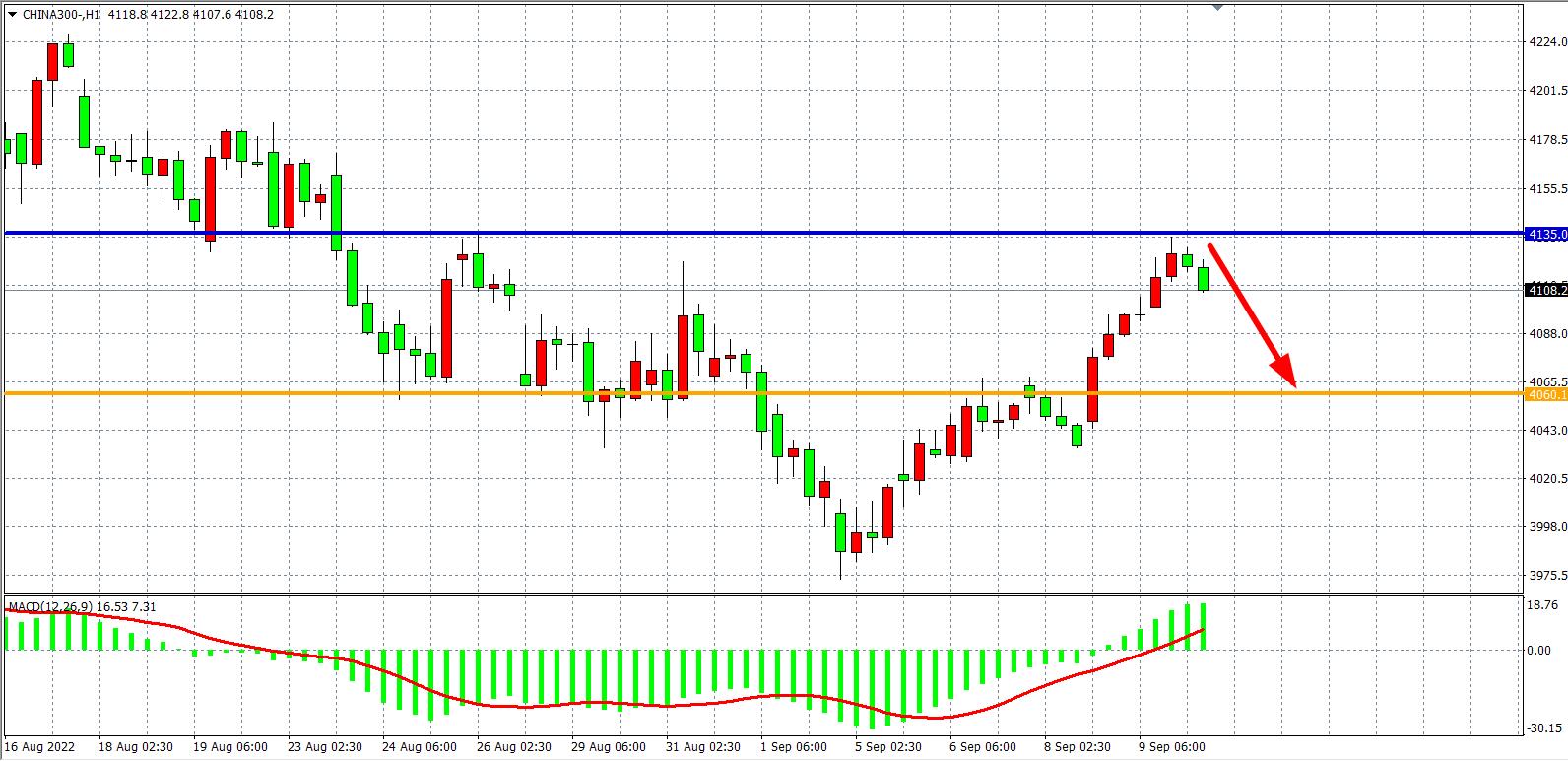 1小时图看,沪深300反抽到4135压力位后出现回落,短线阻力已确认,MACD于零轴之上开始量能继续放大,显示行情或进入新一阶段的反弹周期,目前4135为强阻力线,日内在该位之下看回调,上破该位则打开新一轮上行空间