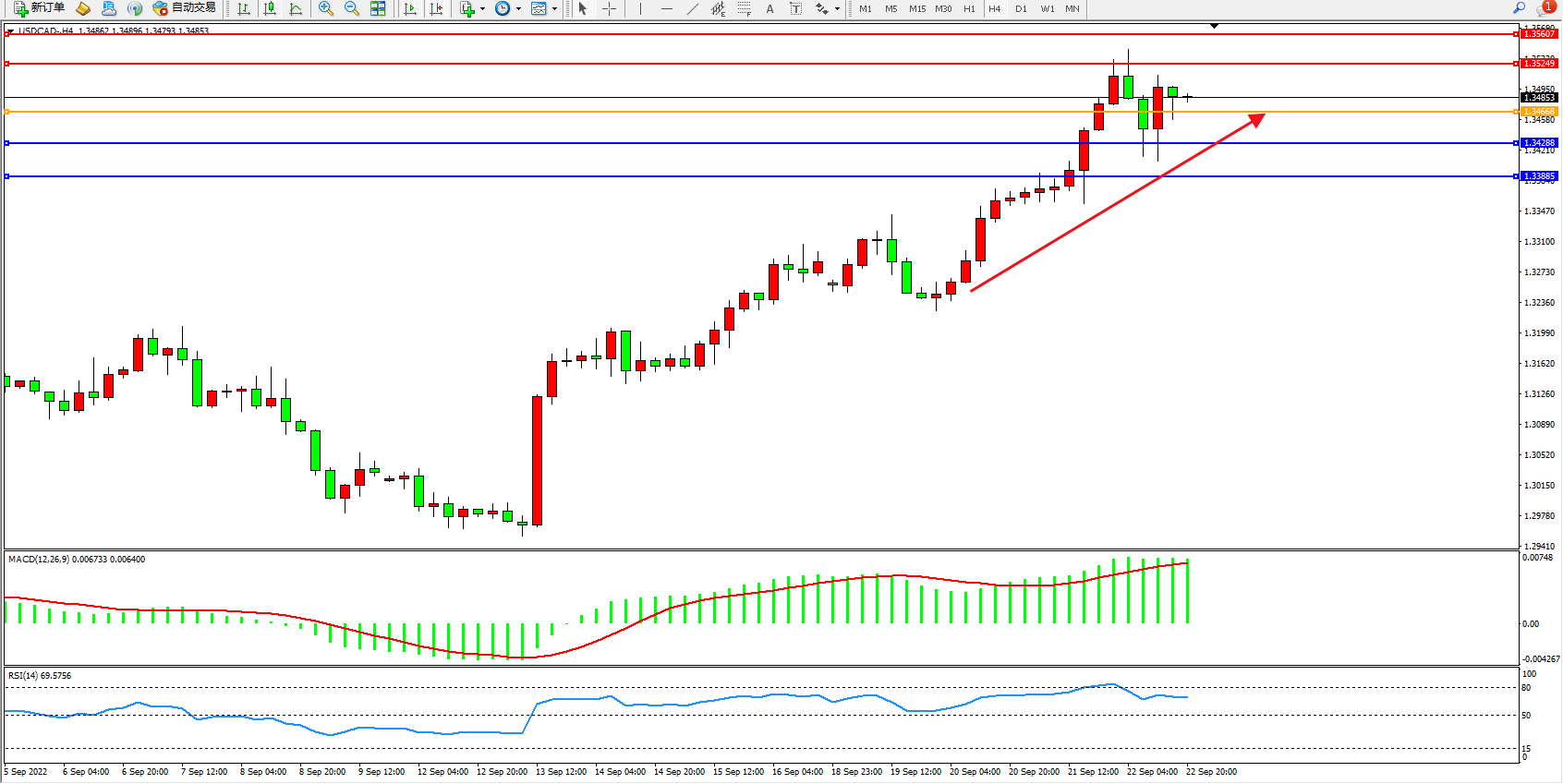 美元加元USDCAD——4小时K线图显示: