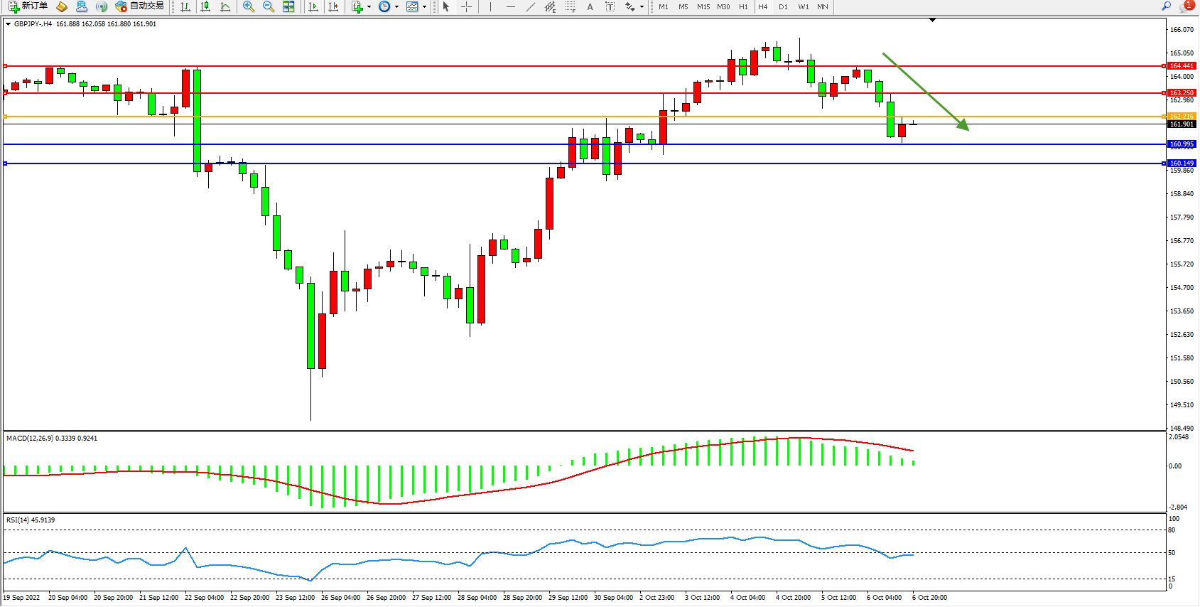 交易策略:162.216下方看跌,目标160.995、160.149