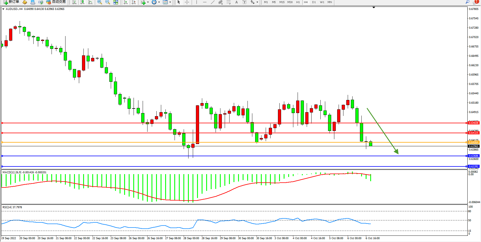 交易策略:0.64064下方看跌,目标0.63686、0.63392