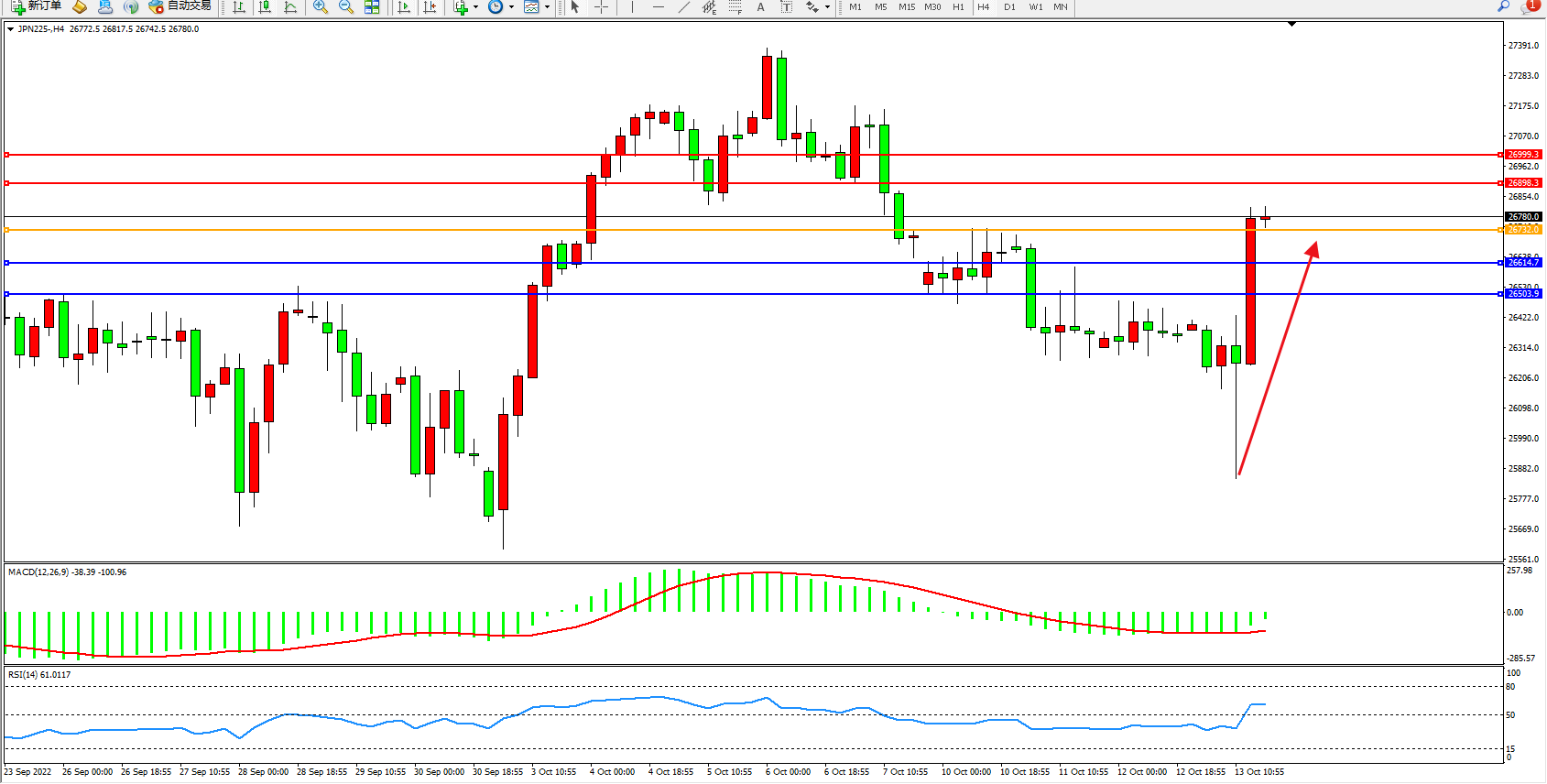 日经指数JPN225——4小时K线图显示: