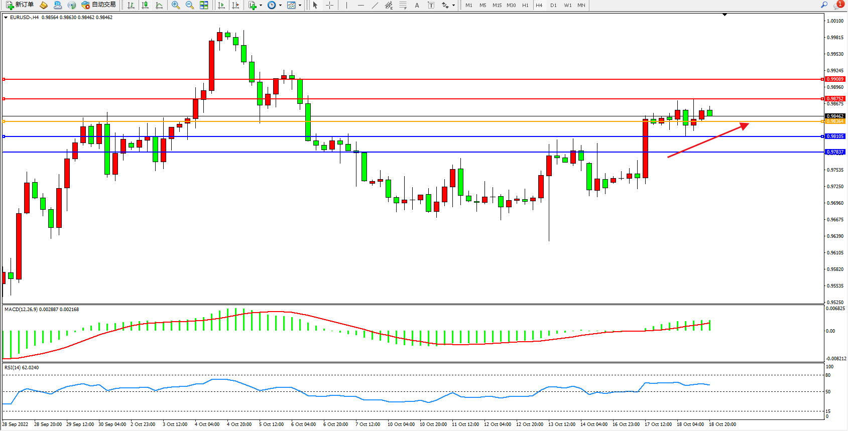 欧元兑美元维持0.98462附近震荡,欧元区面临高通胀和低增长的双重困难,还包括技术性衰退的可能性。
