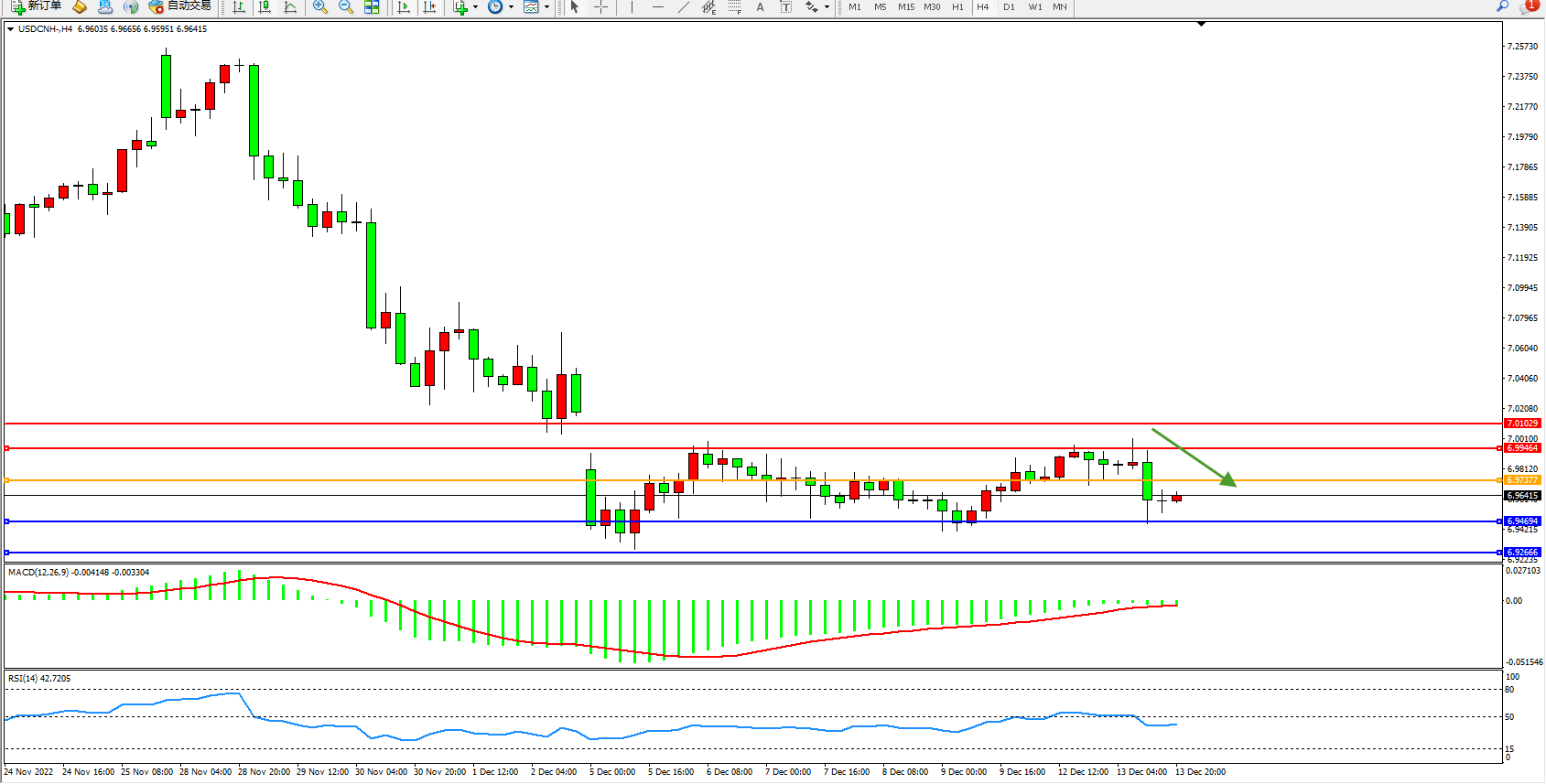 美元人民币USDCNH——4小时K线图显示: