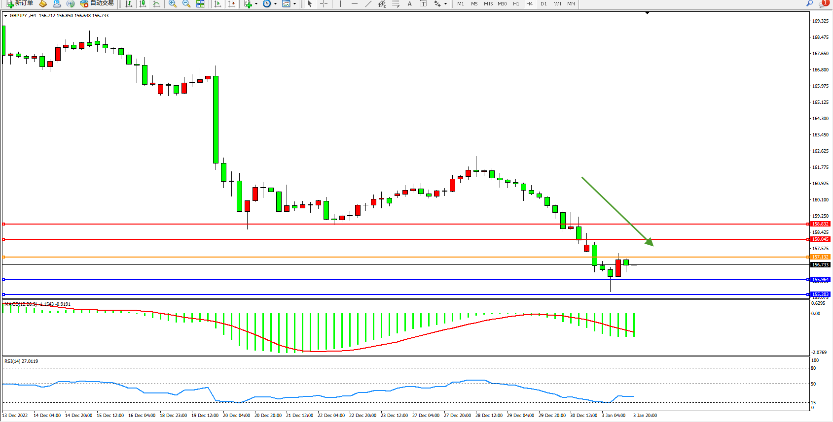 交易策略:157.132下方看跌,目标155.964、155.203