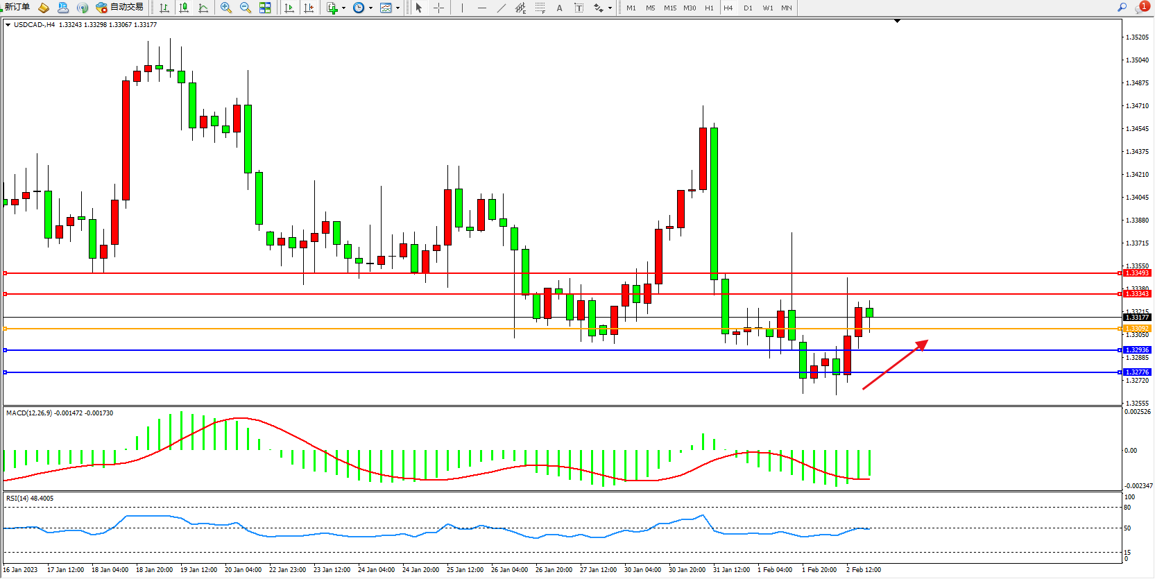 美元加元USDCAD——4小时K线图显示: