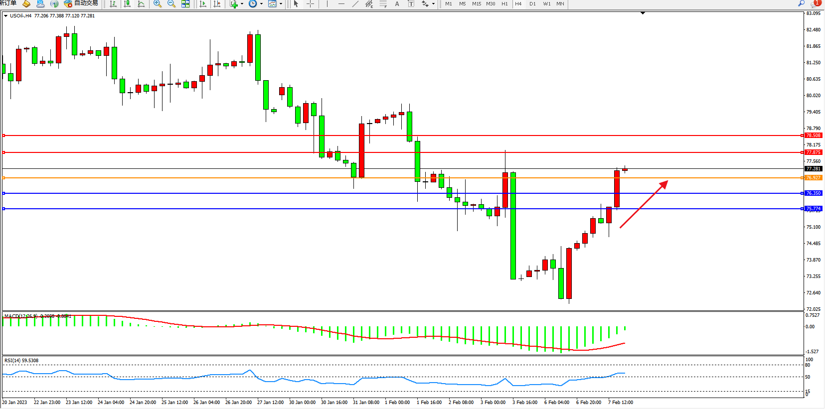 交易策略:76.927上方看涨,目标76.350、75.774