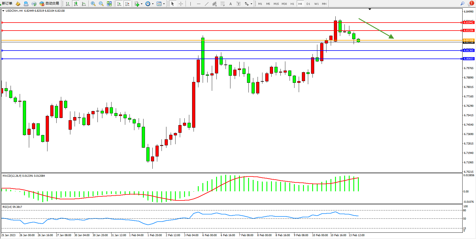 交易策略:6.82308下方看跌,目标6.81365、6.80603